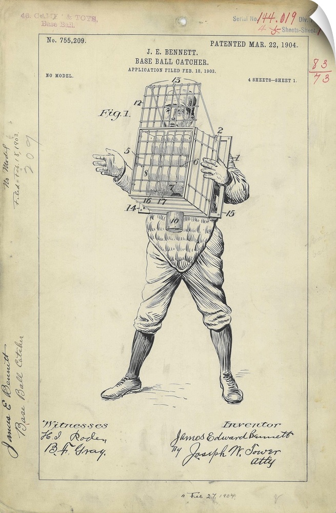 <p>Baseball catcher patent, 1904. Artwork of a baseball catching device invented by James E. Bennett. A wire cage strapped across the person's chest acts as a receptacle to catch balls traveling through the air. Once a ball is caught, the cage closes automatically. A wire mesh protects the catcher's face from impact.</p>