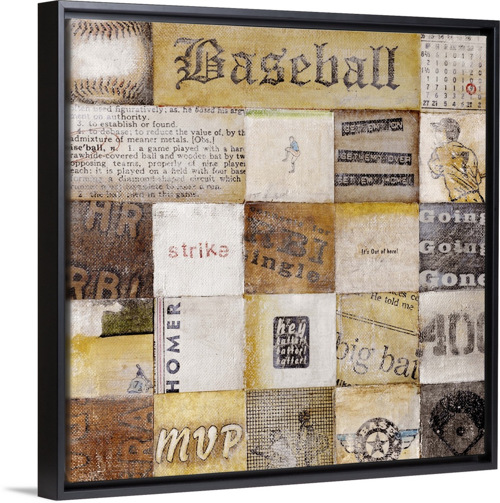 <p>Distressed collage of retro baseball images, terms and sayings in a checkerboard pattern.</p>
