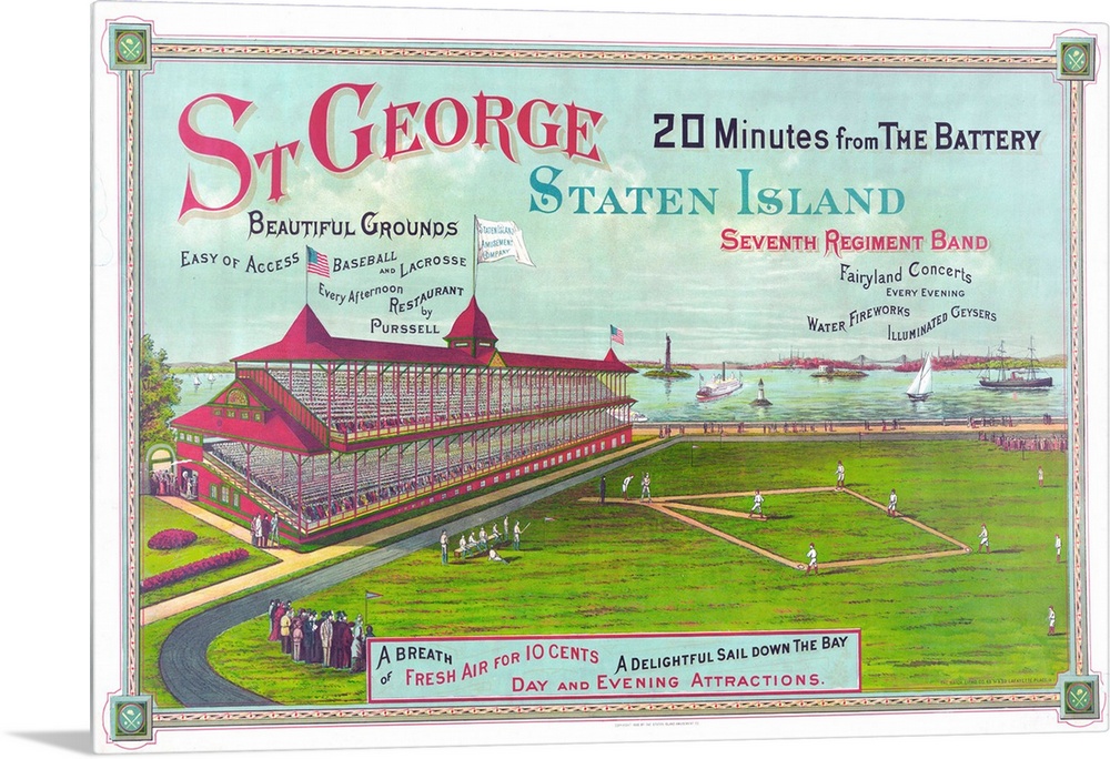 <p>Baseball Field at St. George Park, Staten Island New York, with a view of New York harbor, chromolithograph, 1886, published by The Staten Island Amusement Company and printed by The Hatch Litho. Company.</p>