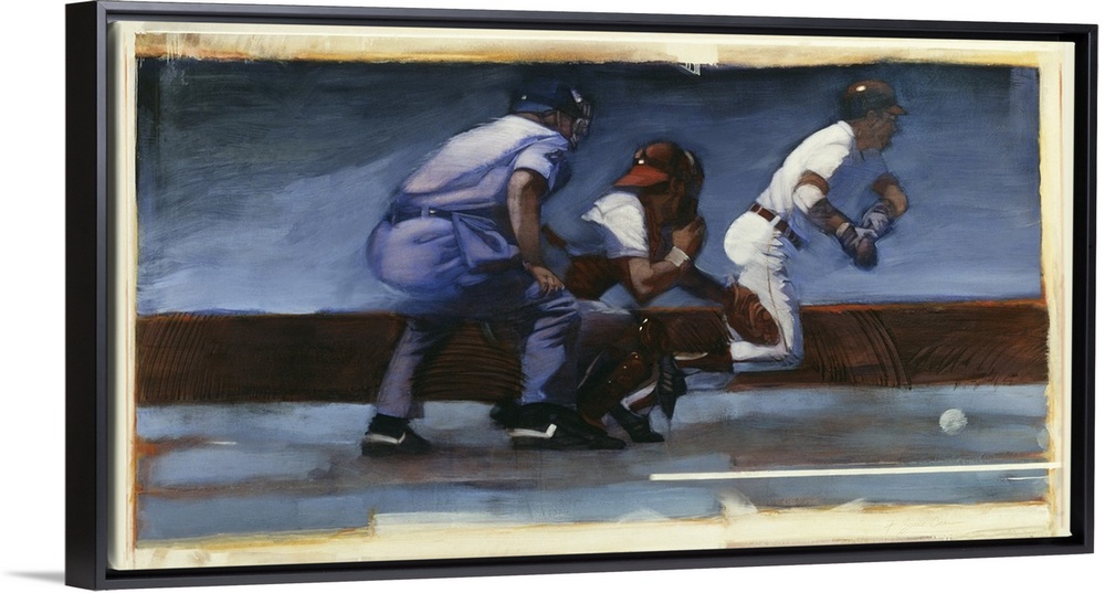 <p>A contemporary design of a batter swinging his bat at a baseball during a game with roughen edges along the sides.</p>