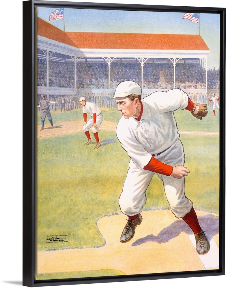 <p>This classic lithograph by the Donaldson Brothers, renowned for their baseball imagery, captures the poised intensity of America's early pastime. The pitcher, framed in mid-windup, stands front and center in a pristine white uniform with red accents-standard colors of the era's teams. The packed grandstand, fluttering flags, and sharply dressed infielders evoke a golden age of baseball when the sport was both spectacle and civic ritual. A fine example of early sports advertising art, this piece celebrated not just the game, but the growing national identity it represented.</p>