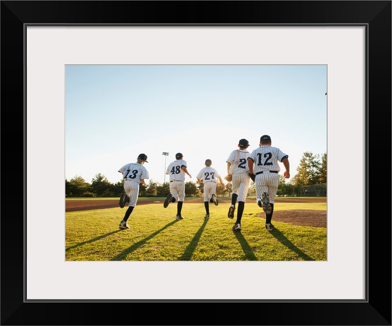 <p>Baseball players (10-11) running on baseball diamond</p>