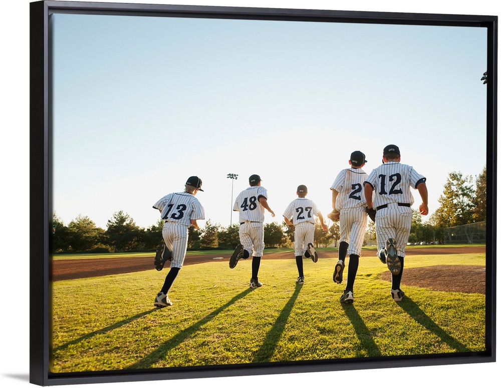 <p>Baseball players (10-11) running on baseball diamond</p>