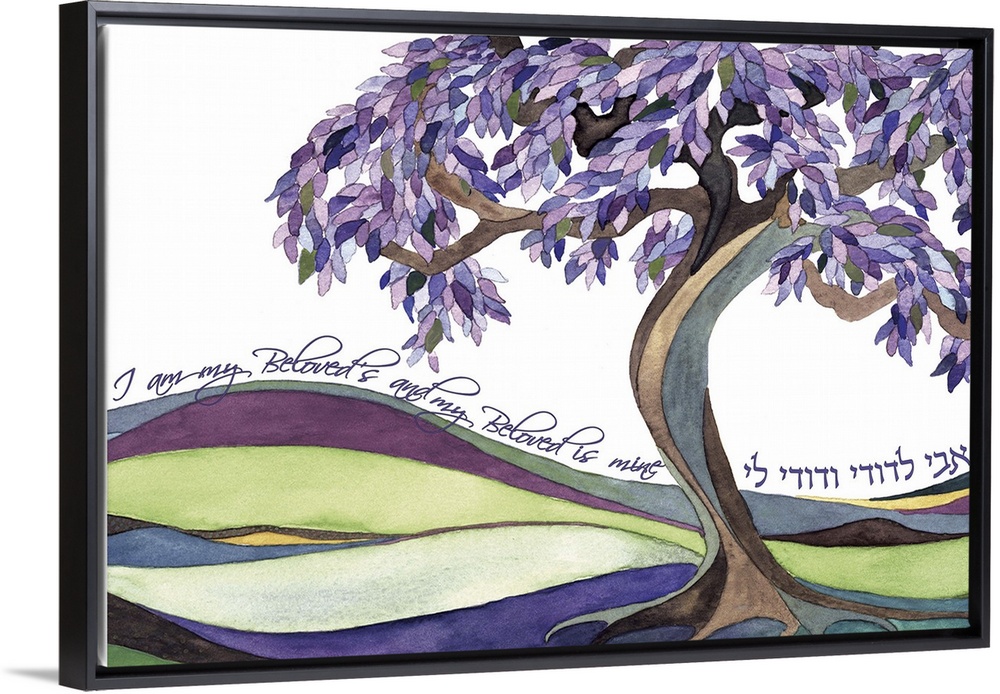<p>Watercolor painting of a tree with a curved trunk and leafy branches in a field, with the text "I am my Beloved's and my Beloved is mine" and Hebrew lettering.</p>
