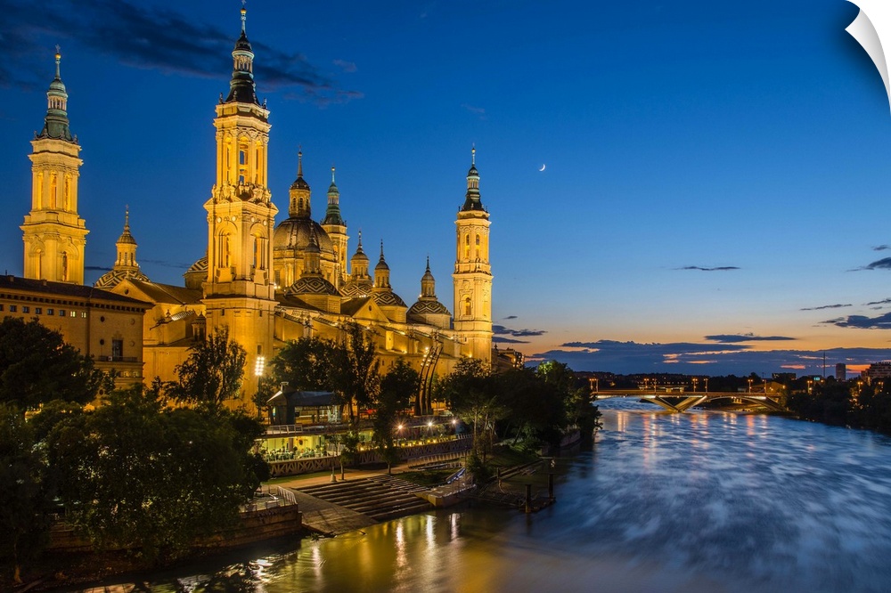 <p>Basilica de Nuestra Senora del Pilar church and Ebro river at dusk, Zaragoza, Aragon, Spain</p>
