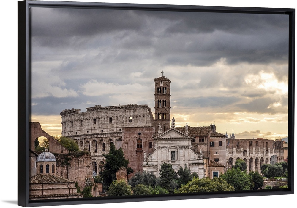<p>Basilica of Santa Francesca Romana and Coliseum at sunrise, Rome, Lazio, Italy, Europe,</p>