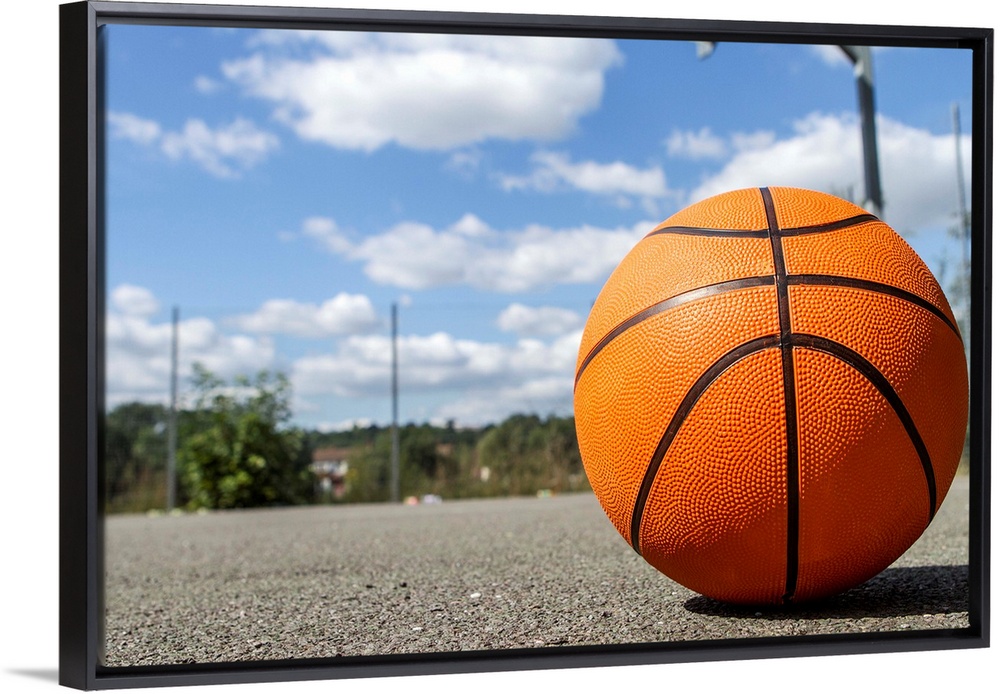 <p>Close up shot of a basketball on a basketball court on a sunny day.</p>