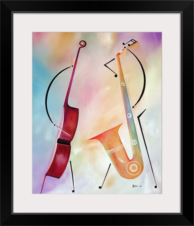 <p>An abstract piece of artwork of a bass standing and a saxophone standing right next to it. The background is multicolored.</p>