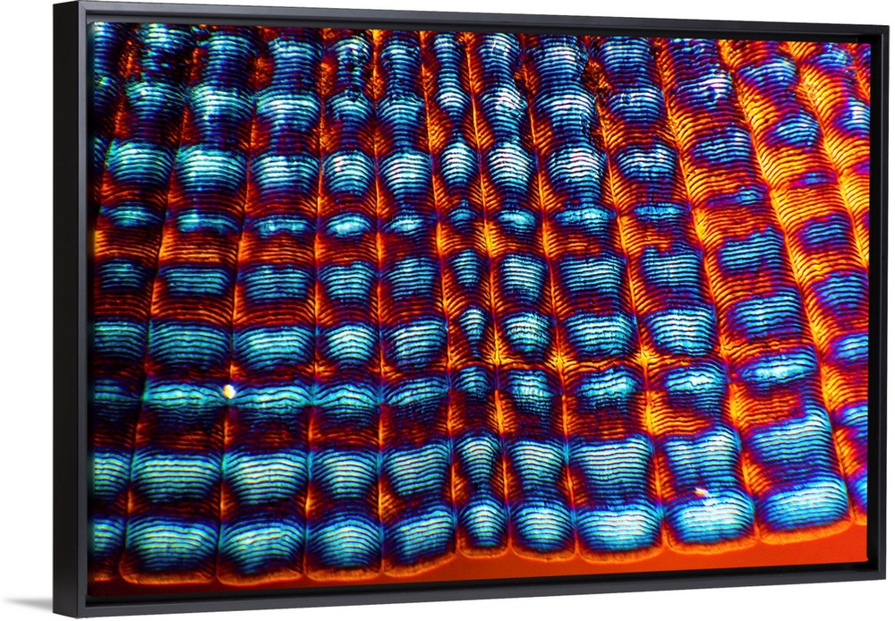 <p>Bass scale. Polarised light micrograph of part of a scale from the skin of a bass (Dicentrarchus labrax). The scales are just under the fish's skin and form a protective skeleton. Each scale plate consists of a lower fibrous plate and an upper clear plate of dentine. Dentine is added to the edge of the plate each year. In the summer the plate grows faster (thick ring) than in the winter (thin ring), so each year's growth is demarcated. On this scale, there are around ten concentric growth rings, which means the bass is approximately ten years old. Magnification: x103 when printed at 10 centimetres across.</p>