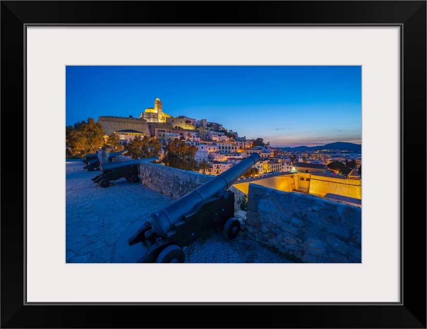 <p>View of Bastion, cannons, ramparts, Cathedral and Dalt Vila old town at dusk, UNESCO World Heritage Site, Ibiza Town, Balearic Islands, Spain, Mediterranean, Europe</p>