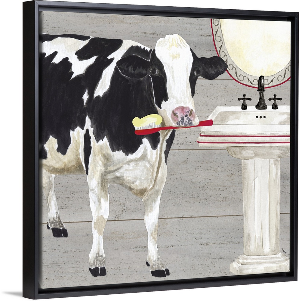 <p>A black and white cow holding a toothbrush at a bathroom sink against of grey wood background.</p>