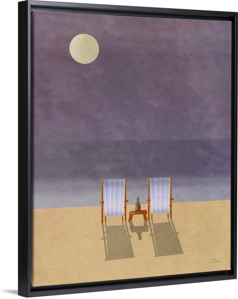 <p>Two beach chairs on the sand under a full moon.</p>