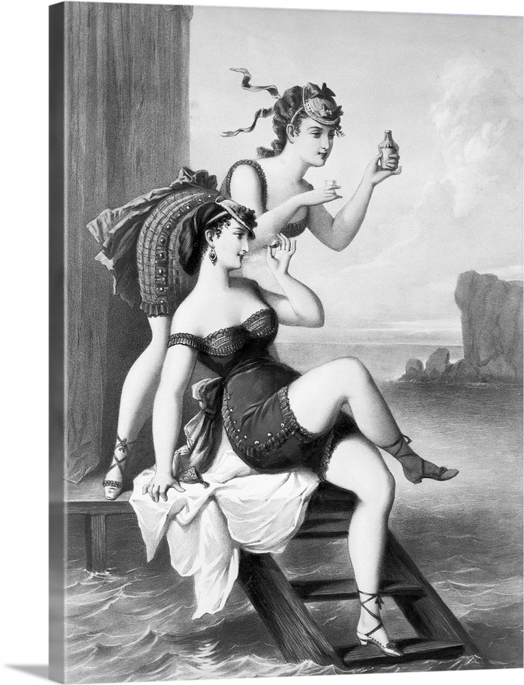 <p>Bathing beauties in front of a bath house (Les Biches a la Mer.) French, ca. 1875.</p>