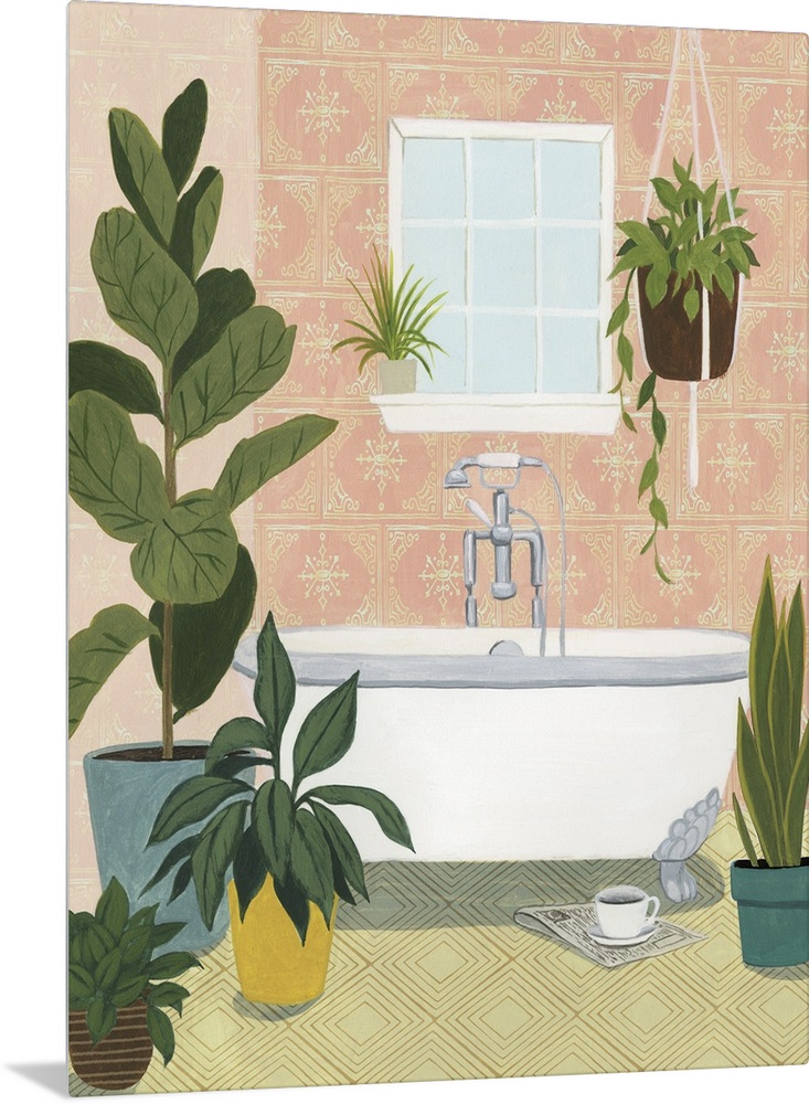<p>Fun contemporary painting of a bathroom decorated with bright green foliage.</p>