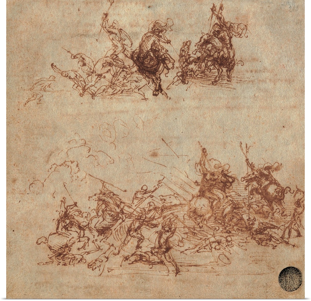 <p>Leonardo da Vinci, Study for the Battle of Anghiari: Fight between Foot Soldiers and Riders (Two Fights between Riders and Foot Soldiers), 1504 - 1506, 16th Century, watercolor shades, ink, browned paper, Italy, Veneto, Venice, Accademia Art Galleries, (5</p>