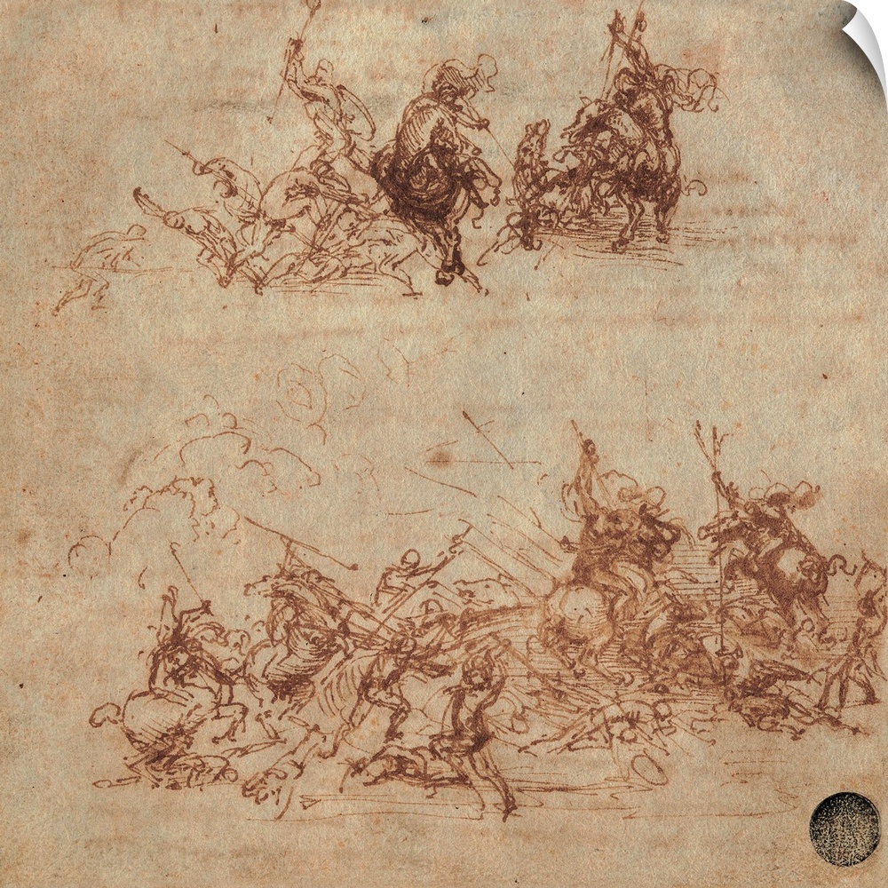 <p>Leonardo da Vinci, Study for the Battle of Anghiari: Fight between Foot Soldiers and Riders (Two Fights between Riders and Foot Soldiers), 1504 - 1506, 16th Century, watercolor shades, ink, browned paper, Italy, Veneto, Venice, Accademia Art Galleries, (5</p>