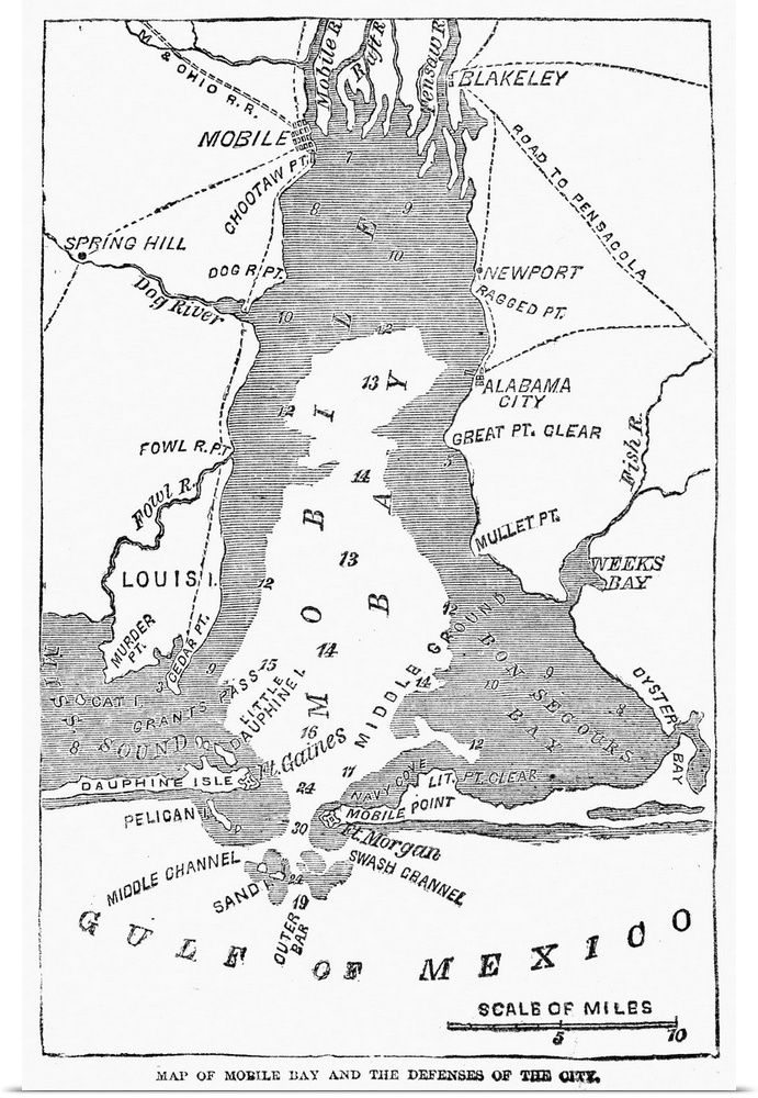 <p>Battle Of Mobile Bay, 1864. Map Of the Site Of the Union Naval Victory At the Battle Of Mobile Bay, Alabama, 5 August 1864. Wood Engraving From A Contemporary American Newspaper.</p>
