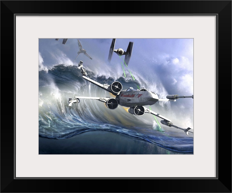 <p>An X-Wing flying over the ocean on Kamino. Kamino is a fictional ocean planet, in the fictional Star Wars universe. It was here that the Army of the Republic was generated.</p>