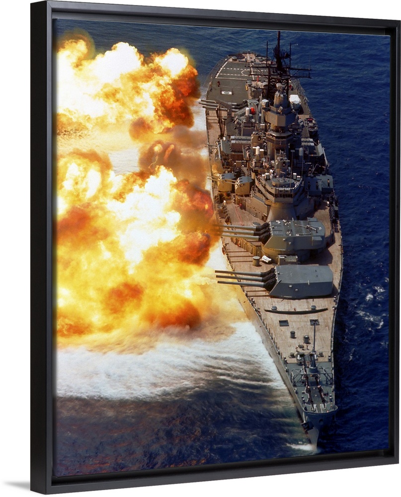 <p>Battleship USS Iowa firing its Mark 7 16-inch/50-caliber guns.</p>