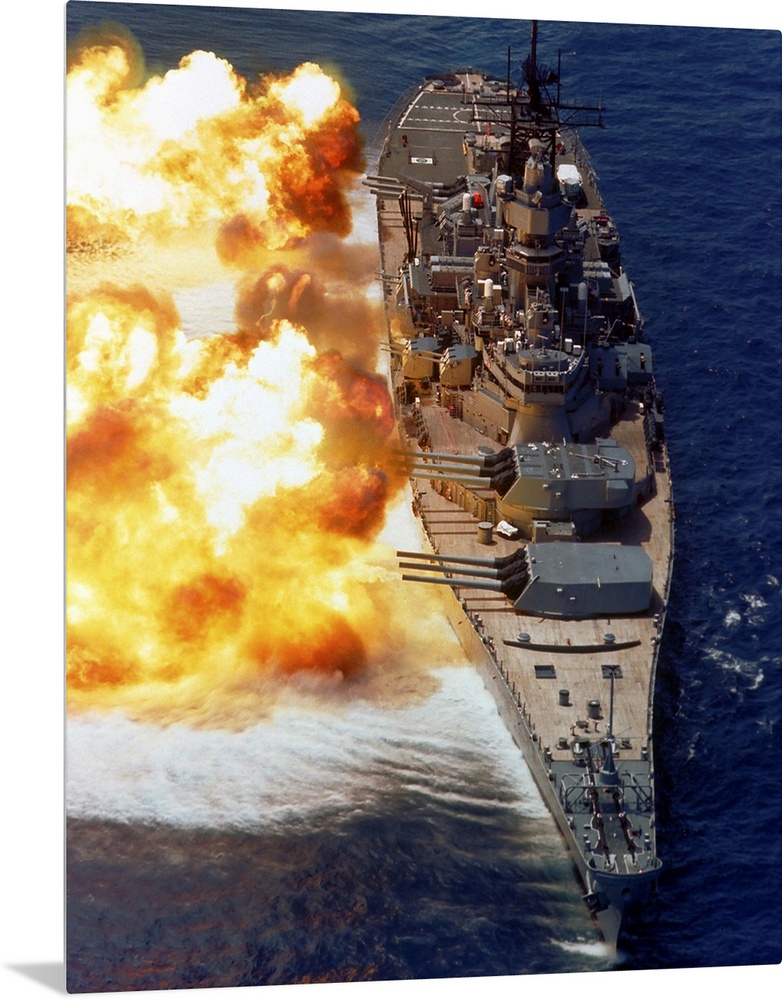 <p>Battleship USS Iowa firing its Mark 7 16-inch/50-caliber guns.</p>