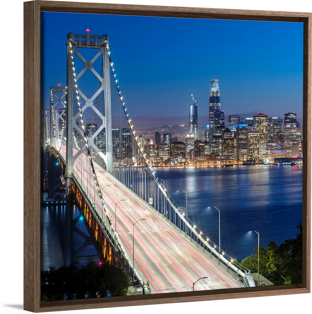 <p>Square photograph of the Bay Bridge at dusk with downtown San Francisco lit up in the background.</p>