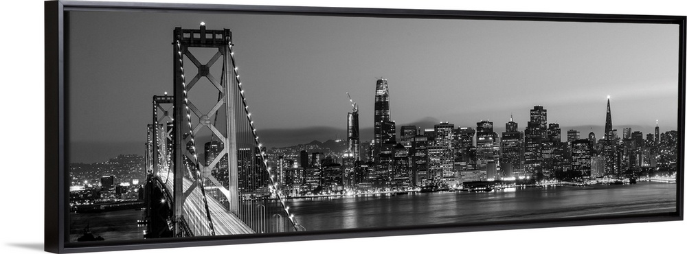 <p>Photograph of the Bay Bridge and the San Francisco skyline lit up at dusk.</p>