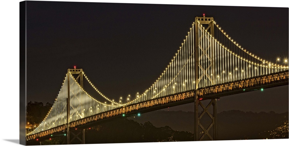 <p>Suspension bridge lit up at night, Bay Bridge, San Francisco Bay, San Francisco, California, USA.</p>