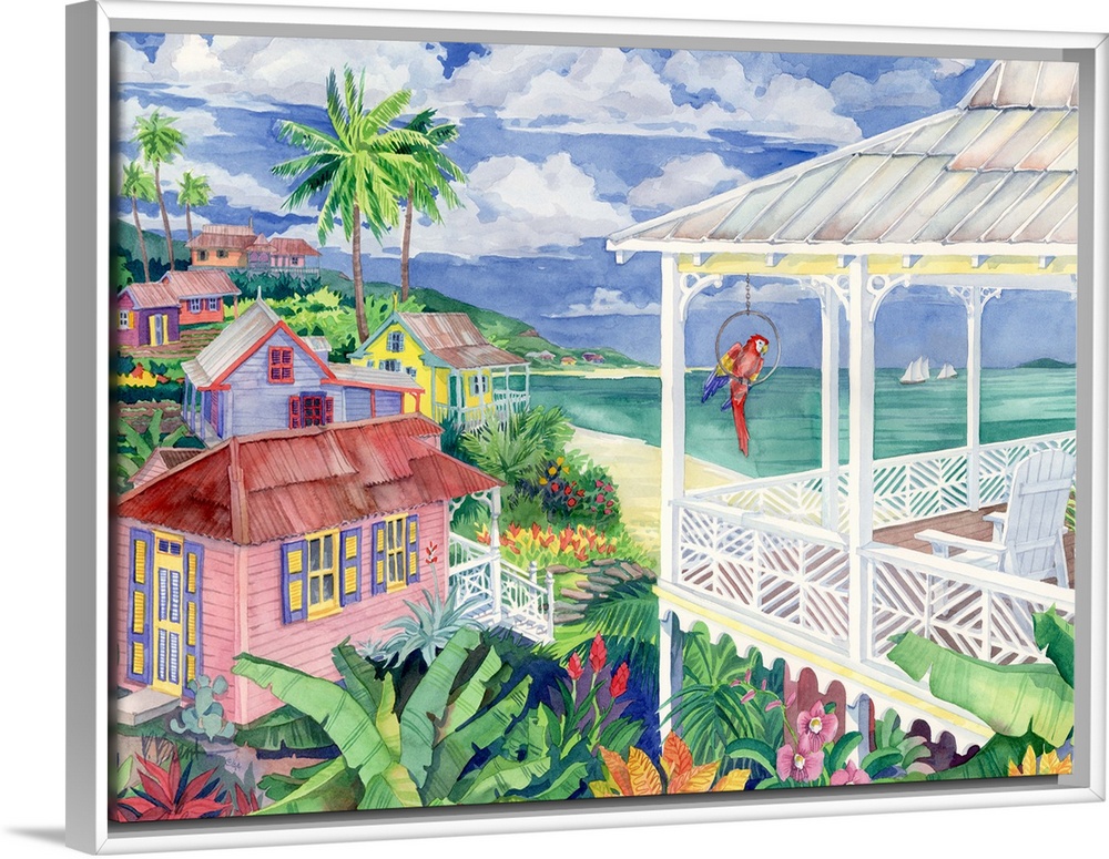 <p>Watercolor painting of a Caribbean resort town.</p>