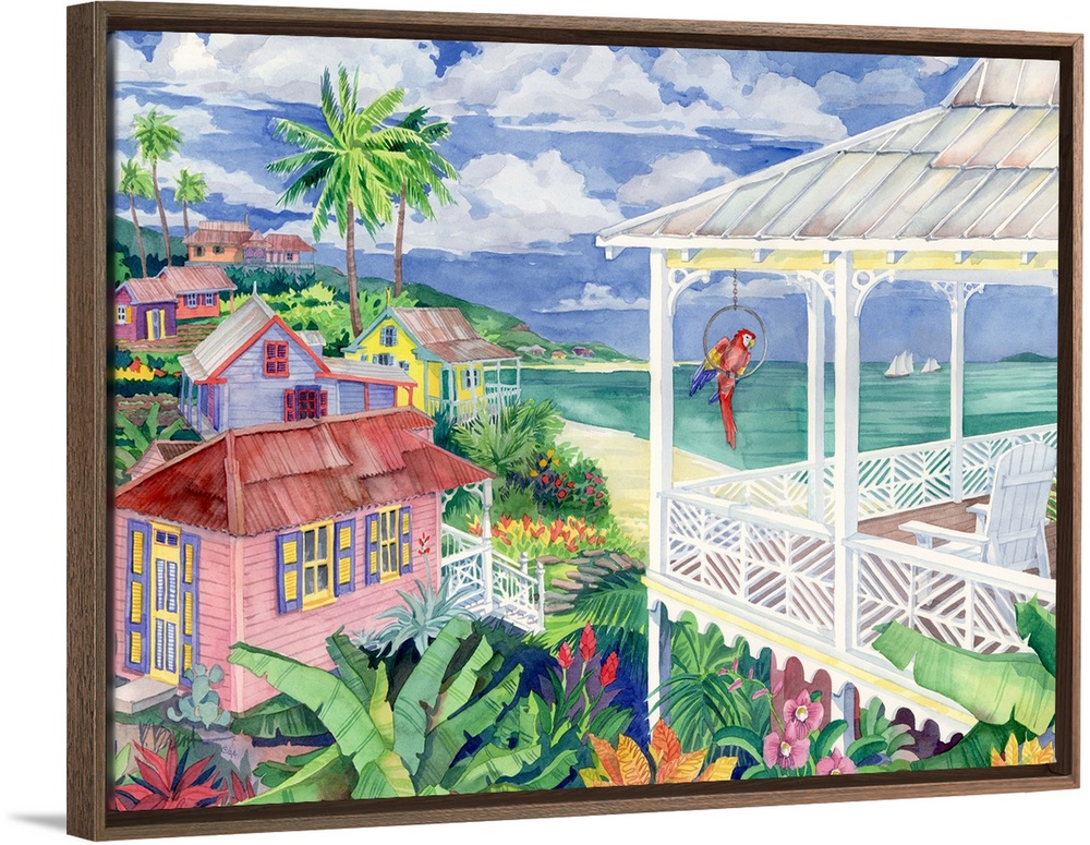<p>Watercolor painting of a Caribbean resort town.</p>