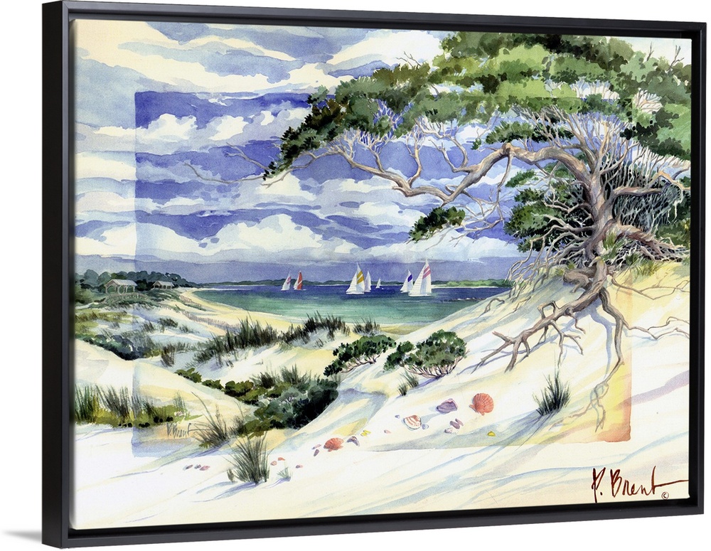 <p>Watercolor painting of a seaside landscape with a sandy beach and a large tree reaching over the dunes.</p>