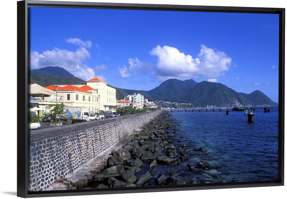 <p>Bay front with ocean and mountains Capital City of Roseau in Dominica.</p>