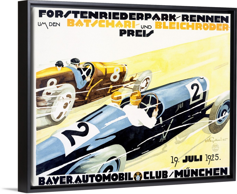 <p>Classic advertisement for a Bayer Automobile Club race with two race cars moving fast.</p>