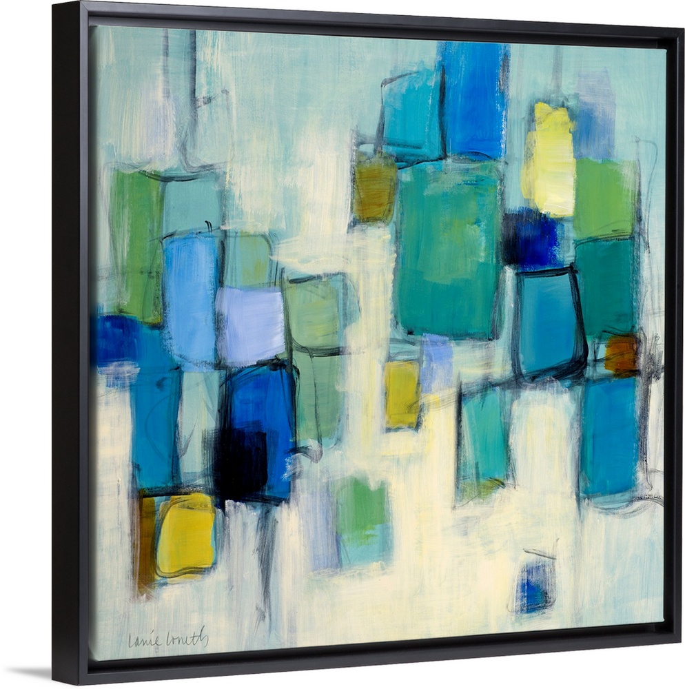 <p>Big abstract art uses a variety of cool toned rectangles and squares to contrast the simple background.</p>