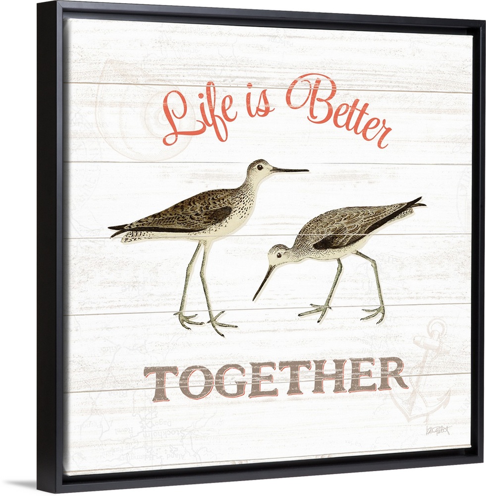 <p>Square beach decor with "Life is Better Together" written around an illustration of two sandpipers, on a white wooden background.</p>