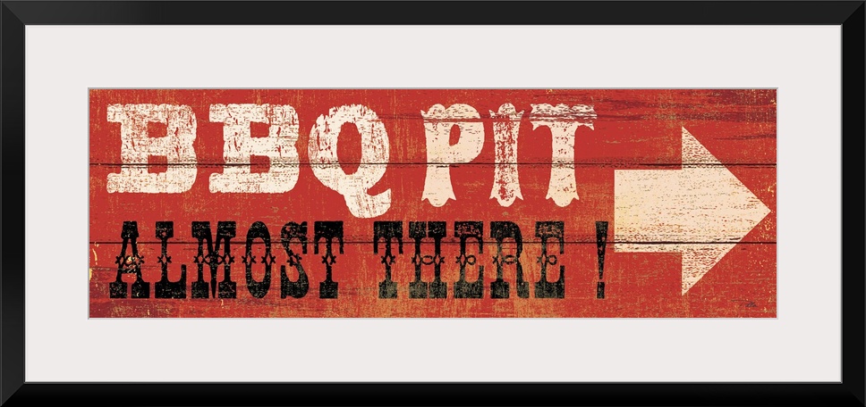 <p>This art piece resembles wood planks with an arrow and text painted saying BBQ Pit, Almost There.</p>