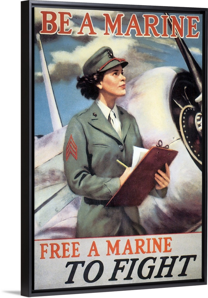 <p>Vintage propaganda artwork of a patriotic woman standing by a fighter plane.</p>