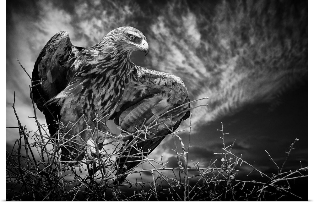 <p>A black and white photograph of a hawk spreading its wings.</p>