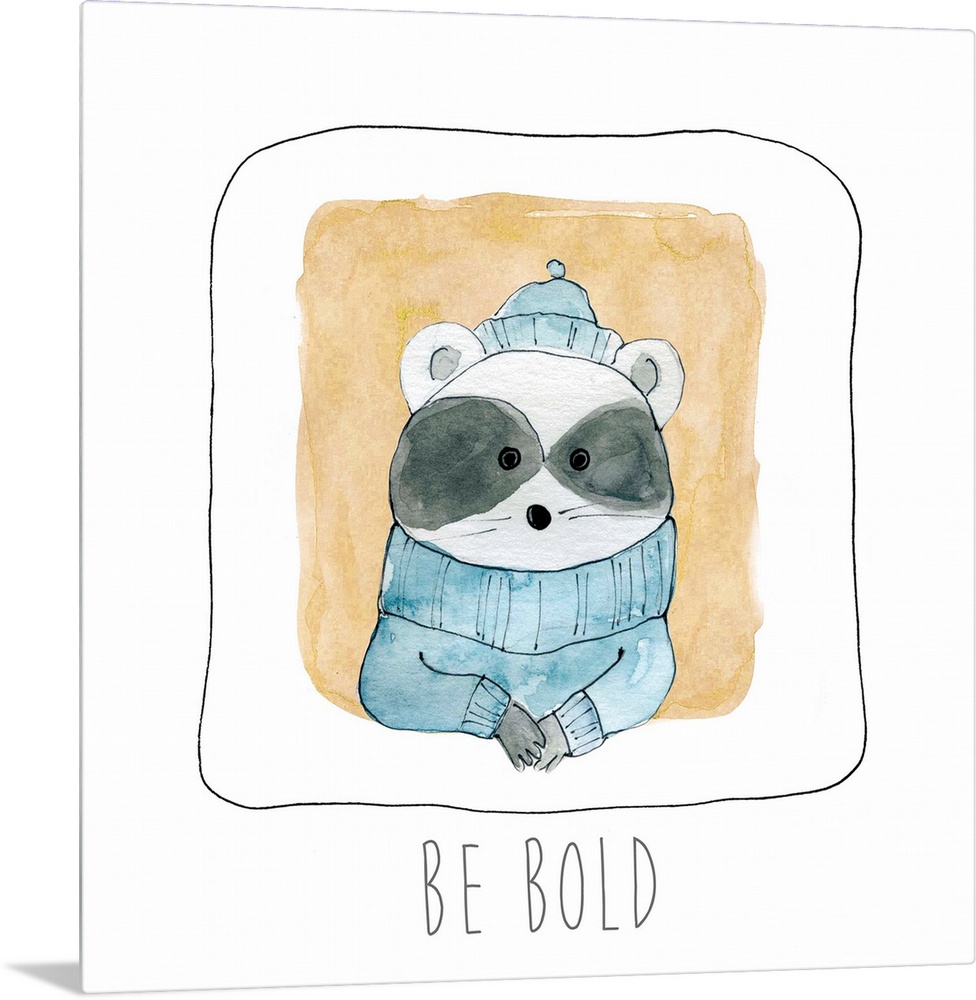 <p>Square whimsy watercolor painting of raccoon wearing a sweater and a hat with the phrase "Be Bold" written at the bottom.</p>