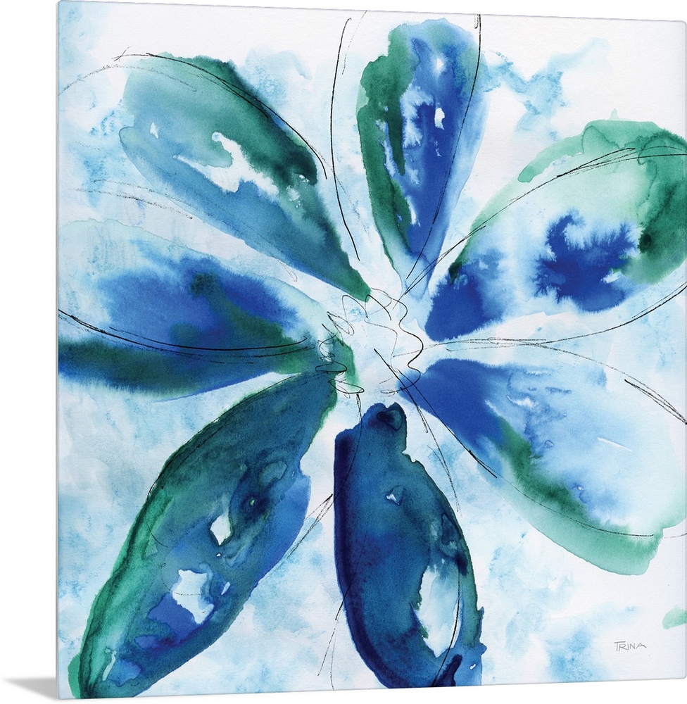 <p>Abstract painting of a flower in blue and green tones with a thin black tracing on a square background.</p>