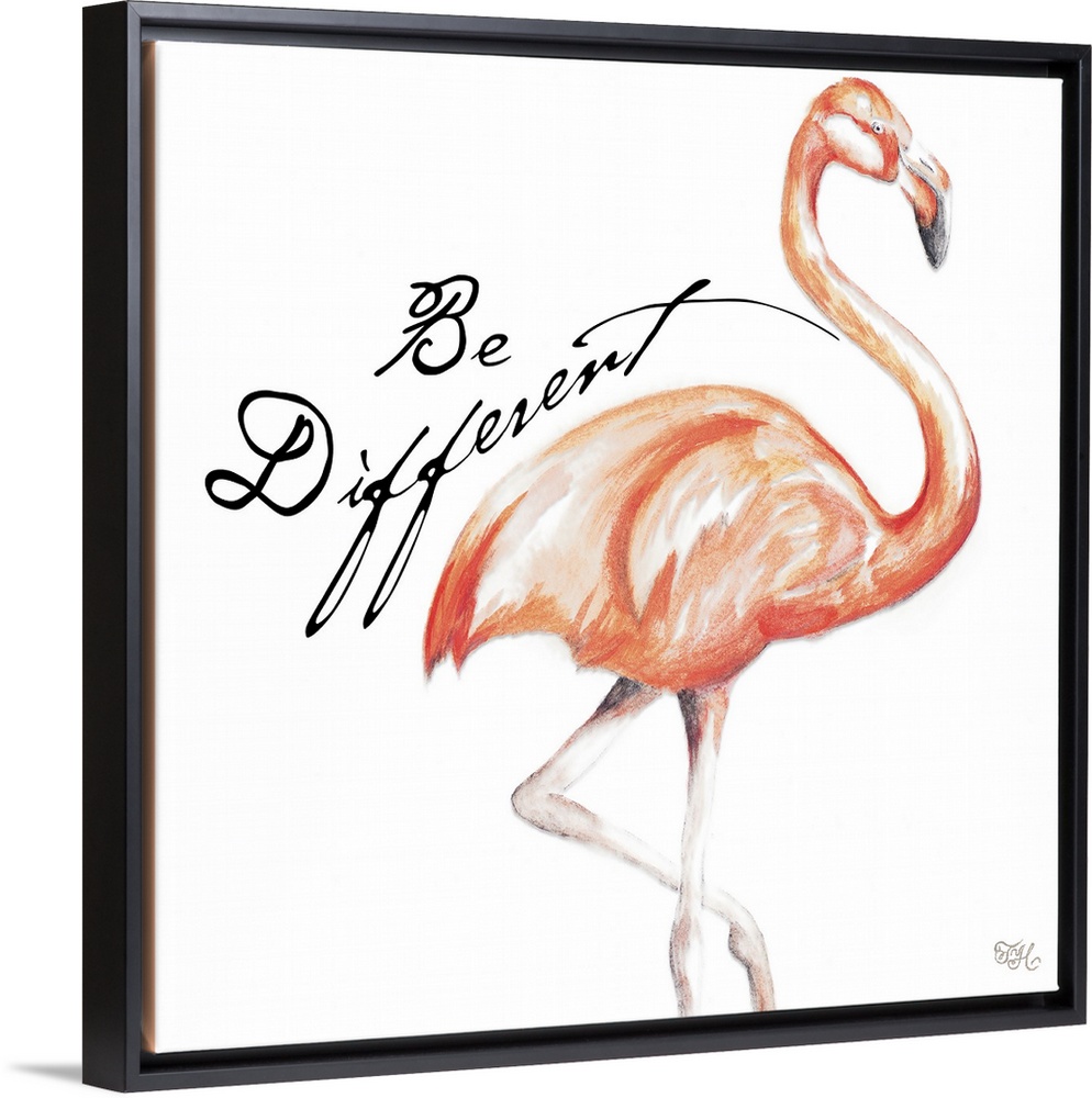 <p>Square illustration of a pink flamingo with the phrase "Be Different" written on the side in black.</p>