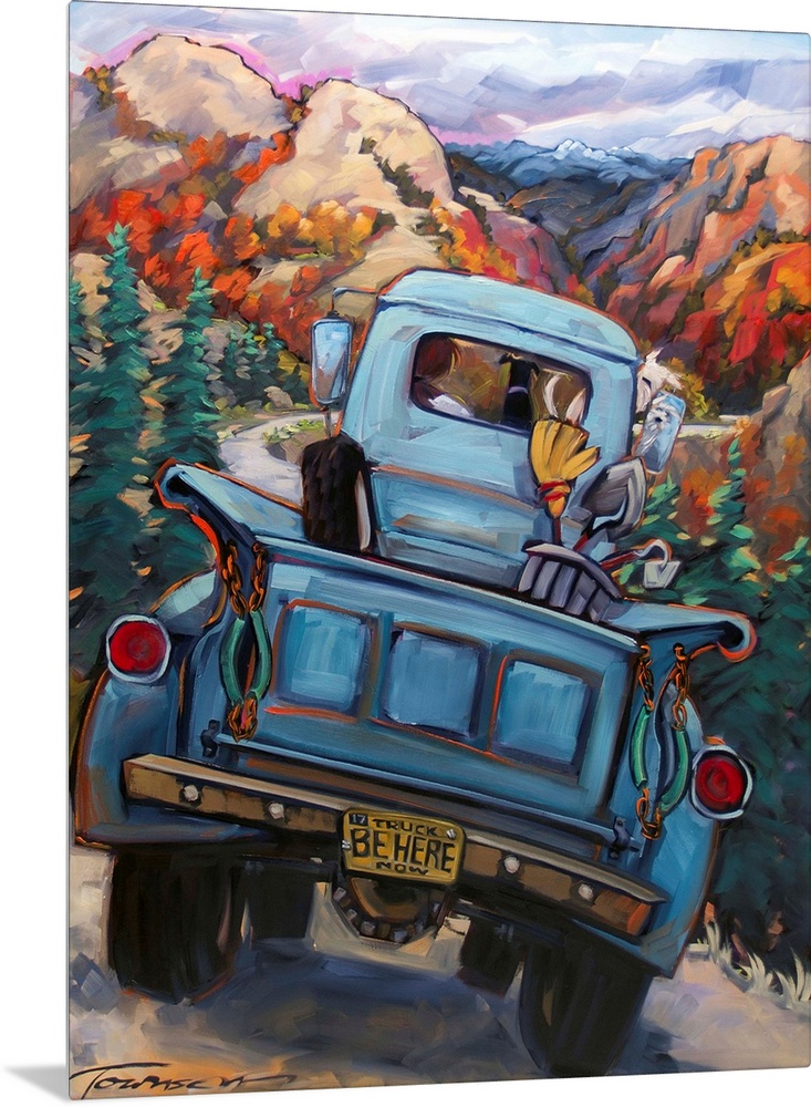 <p>Thick brush strokes create a humorous scene of a dogs riding in a truck on a country road.</p>