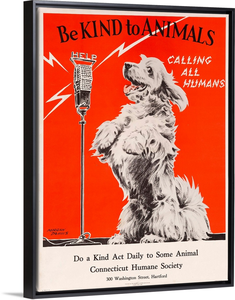 <p>ca 1930s, dog speaking into radio microphone calls on humans to be kind to animals. Illustrated by Morgan Dennis.</p>