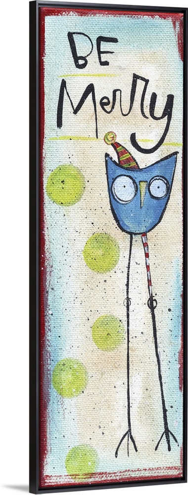 <p>Cute illustration of an owl with long legs wearing a festive hat.</p>