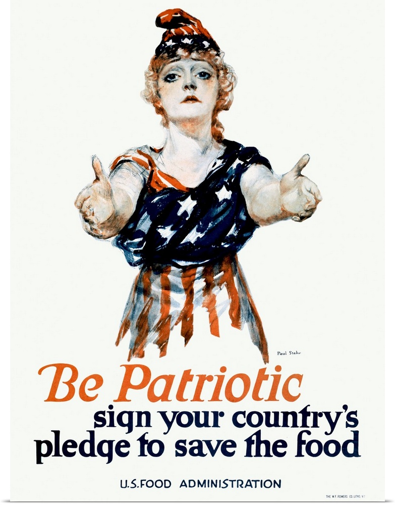 <p>Commissioned by the U.S. Food Administration during World War I, this striking poster features a woman dressed in the American flag, arms outstretched in appeal. It urges citizens to conserve food as a patriotic duty, reinforcing the home front's vital role in wartime success.</p>