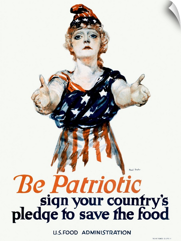 <p>Commissioned by the U.S. Food Administration during World War I, this striking poster features a woman dressed in the American flag, arms outstretched in appeal. It urges citizens to conserve food as a patriotic duty, reinforcing the home front's vital role in wartime success.</p>