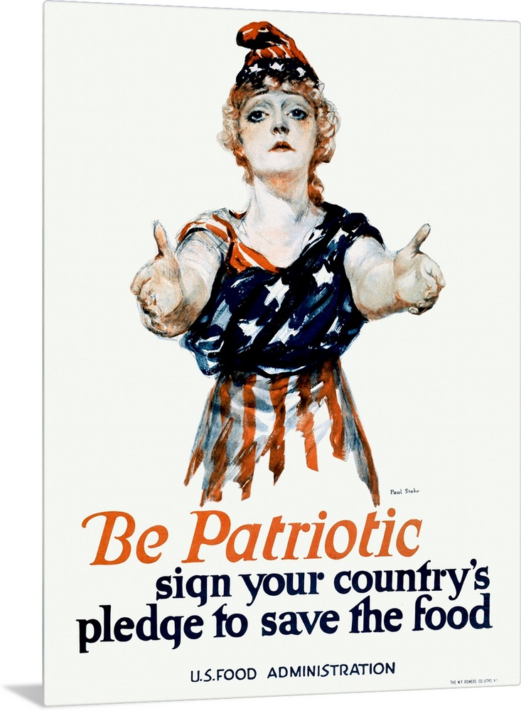 <p>Commissioned by the U.S. Food Administration during World War I, this striking poster features a woman dressed in the American flag, arms outstretched in appeal. It urges citizens to conserve food as a patriotic duty, reinforcing the home front's vital role in wartime success.</p>