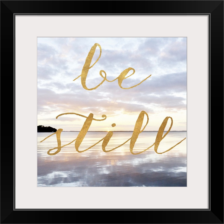 <p>"Be Still" hand written in gold letters over an image of the sea at dawn.</p>