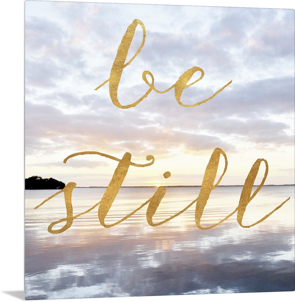 <p>"Be Still" hand written in gold letters over an image of the sea at dawn.</p>
