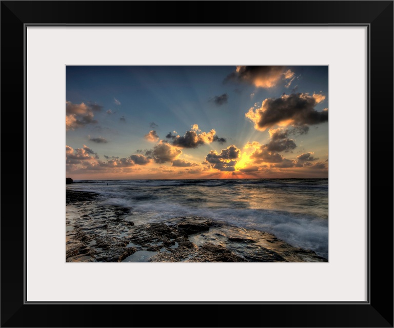 <p>Horizontal photograph of a vibrant, golden sunset at a rocky beach.</p>