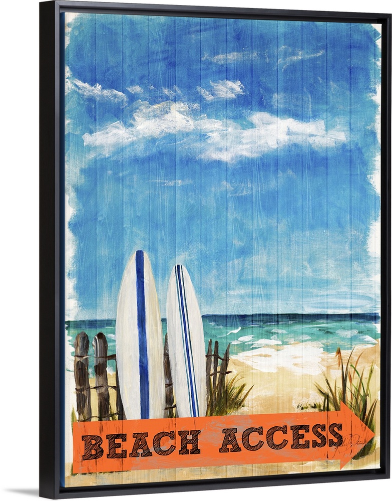 <p>Contemporary painting of two surf boards leaning up against a wooden fence on the beach with an orange arrow below that reads "Beach Access"</p>
